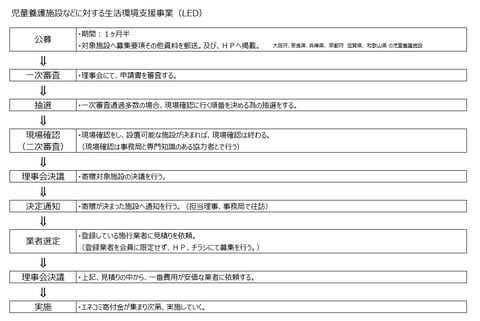 本事業は、JEO会員や一般の方からの寄付金を原資に、クリーンエネルギーと同じ(CO2排出抑制)効果のあるLED設備を児童養護施設に寄贈するものです。