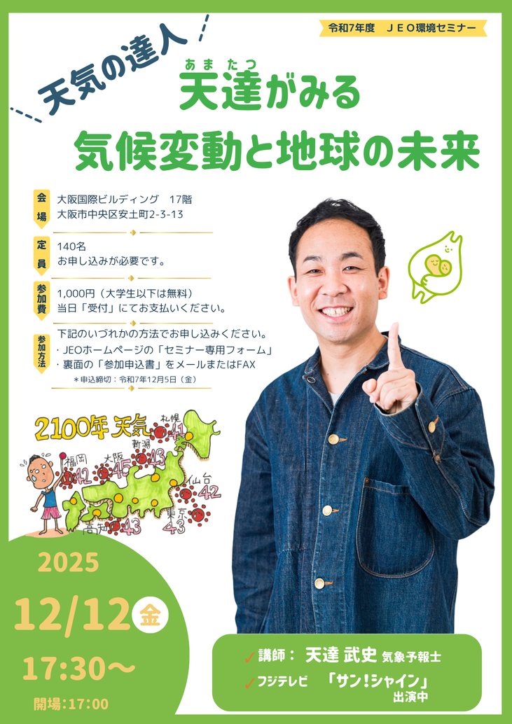そこで本セミナーでは、テレビ番組でもお馴染みの気象予報士・あまたつさんをお迎えし、子どもから大人まで分かりやすく「気候科学」の基本について解説していただきます。